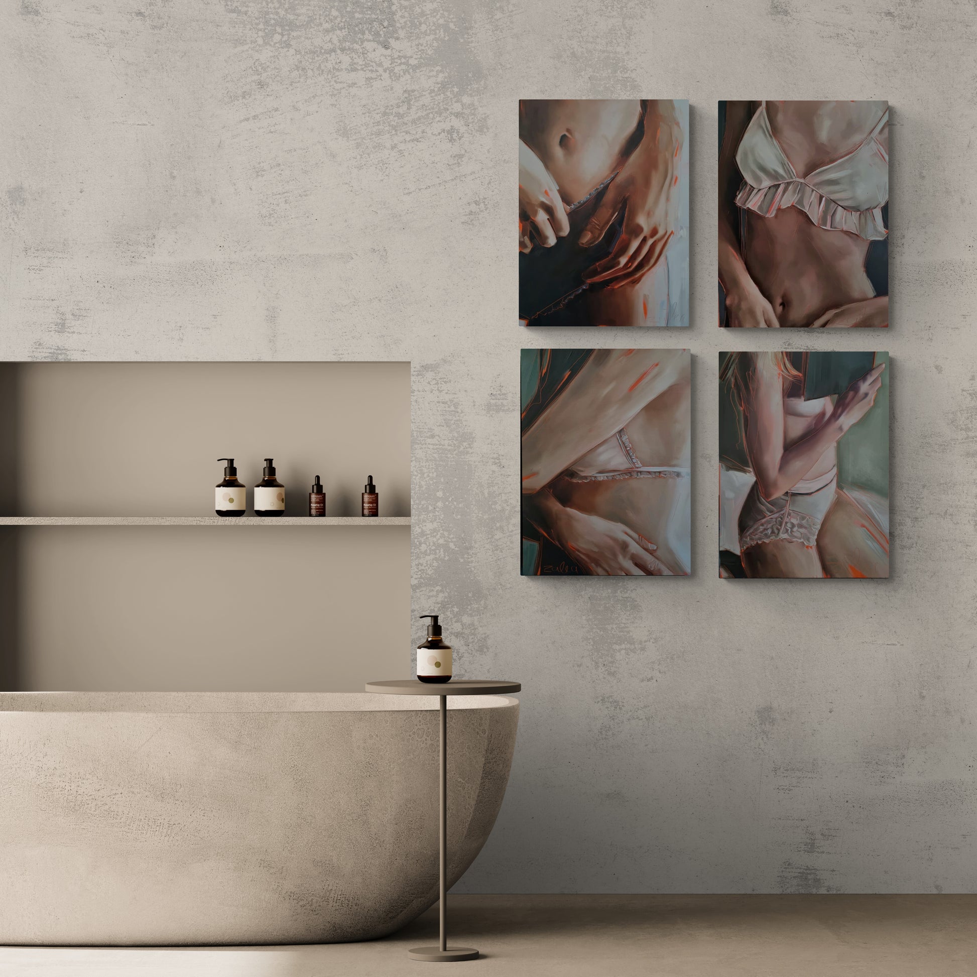 I wanted to paint what it feels like to be a woman, standing in her own skin. Not posing. Not pretending. Just being — boobs, belly rolls, brave heart and all. Some of these women are tugging at a strap, adjusting a bra, covering a bit, revealing a bit. Just like we all do. It’s that quiet, everyday dance between confidence and vulnerability.