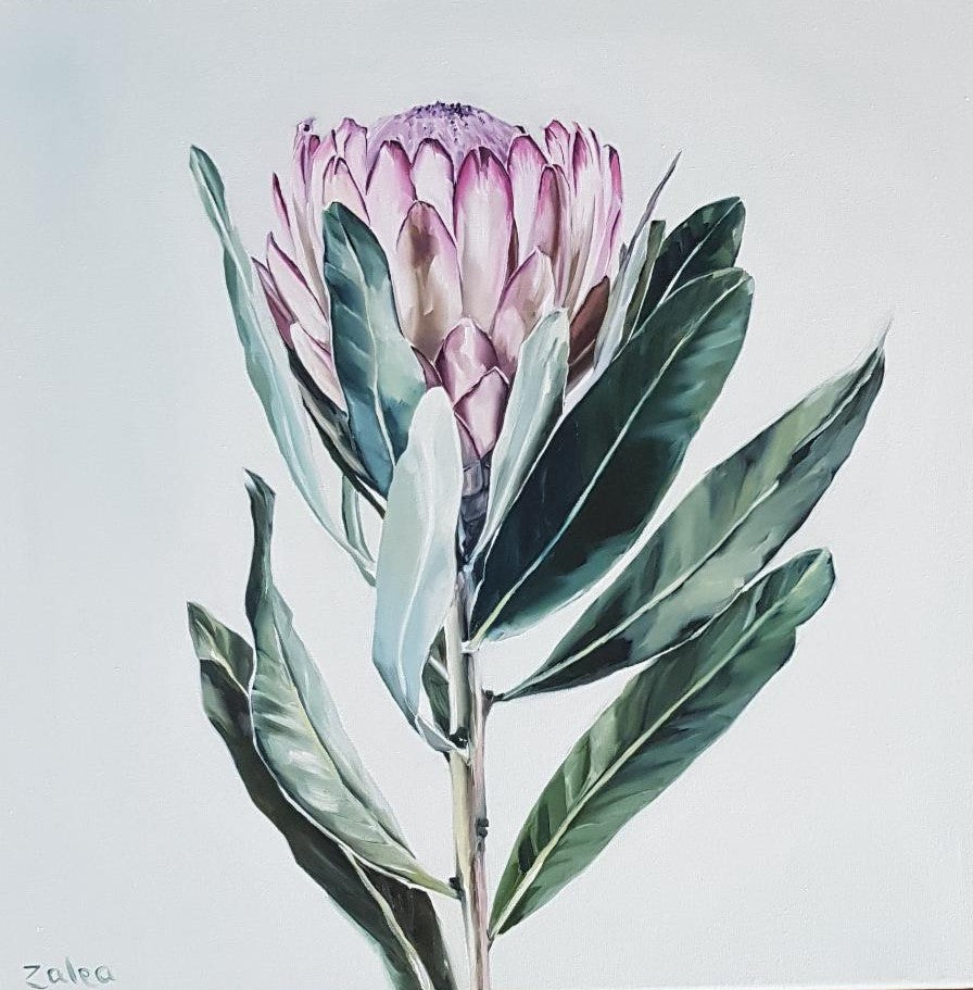 "Ethereal Elegance": This title reflects the ethereal quality of this beautiful South African flower. The painting exudes tranquility and grace, inviting viewers to immerse themselves in the serene beauty of the blooming protea. The artwork embodies a sense of elegance and sophistication, drawing viewers into a world of delicate allure.
