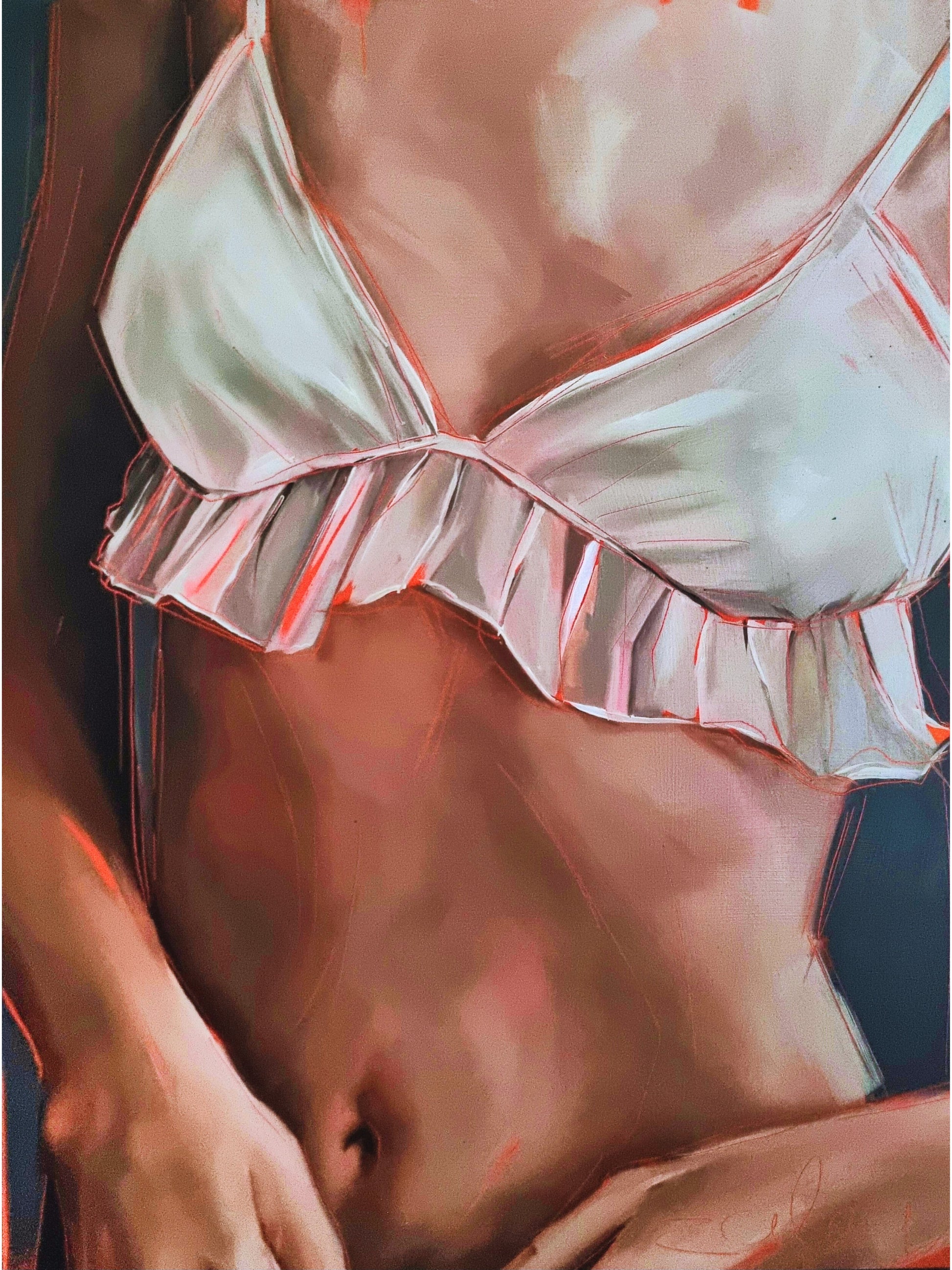 I wanted to paint what it feels like to be a woman, standing in her own skin. Not posing. Not pretending. Just being — boobs, belly rolls, brave heart and all. Some of these women are tugging at a strap, adjusting a bra, covering a bit, revealing a bit. Just like we all do. It’s that quiet, everyday dance between confidence and vulnerability.