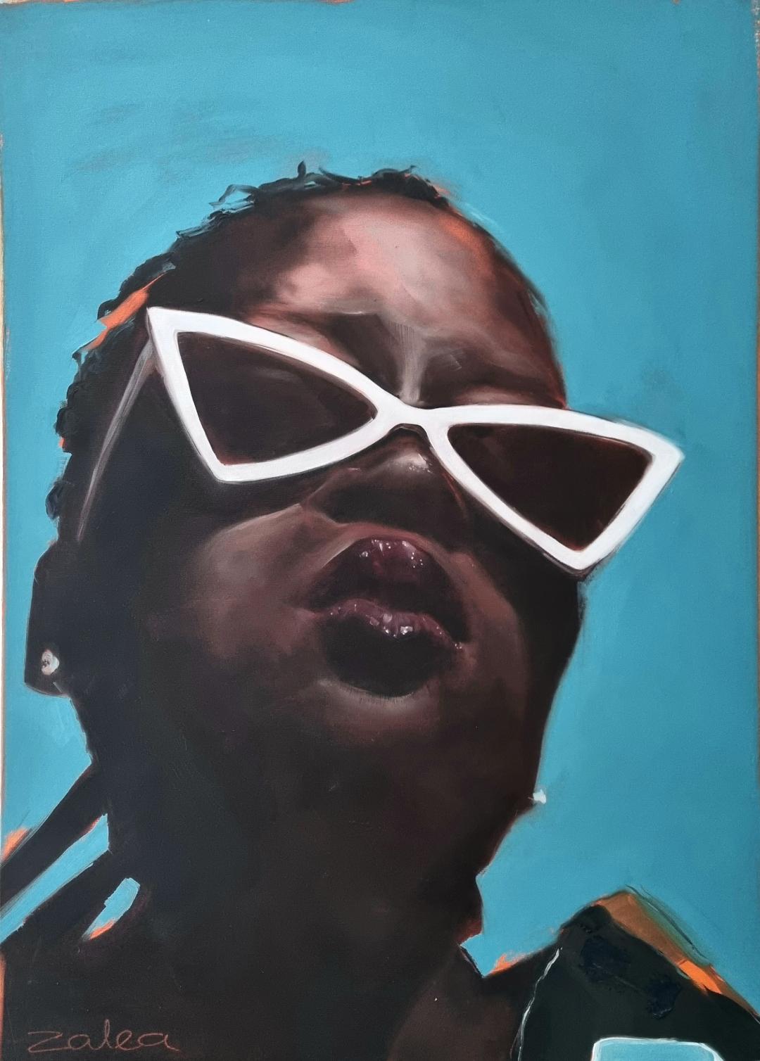 This painting is part of a series of woman from South Africa. This lovely lady is called LESEDI which means 'light'. And even though light usually has a positive connotation, in this case, LESEDI represents women who want to hide from it. Because they are scared to be themselves, scared to be seen. These women feel not worthy and not special. She keeps to herself, hides in the background, never speaks her mind, and feels that no one finds her attractive. Maybe if she loses weight things might change, but eating brings comfort and food can't reject her. Don't get me wrong, LESEDI has friends, but she does not trust them with who she really is. What if they reject her too? But even though she struggles with her confidence, she gives in places where she can't be noticed. She shows up for work at 7am where she is the sole carer of twin boys in a rich suburb. Their parents only arrive back from work at 7pm. Then LESEDI goes back to feed her own family after a two -hour drive. The glasses and scarf she is wearing belongs to the lady she works for. LESEDI found them on her bed when she was making it. She just had to take a photo with them because she will never own anything luxurious like that. How soft it feels...But back to work! The boys want attention and love, and that is what LESEDI is getting paid for.