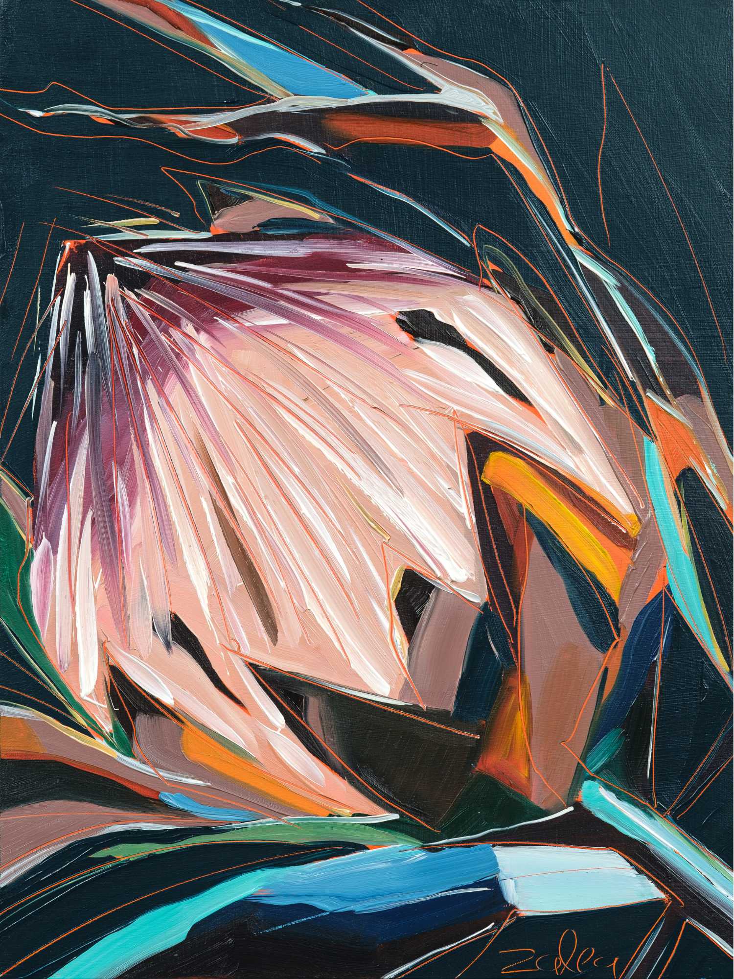 Discover the mesmerising allure of "Moody Moments", set against a captivating dark teal backdrop. The harmonious dance of bright oranges, pinks, whites, and blues brings life and energy to your space, while the subtle scratched details add a touch of depth and uniqueness. With its powerful symbolism of strength and resilience, this artwork serves as an inspiring reminder to embrace life's colorful moments. Own this masterpiece today and infuse your surroundings with a captivating burst of vitality and positivity.