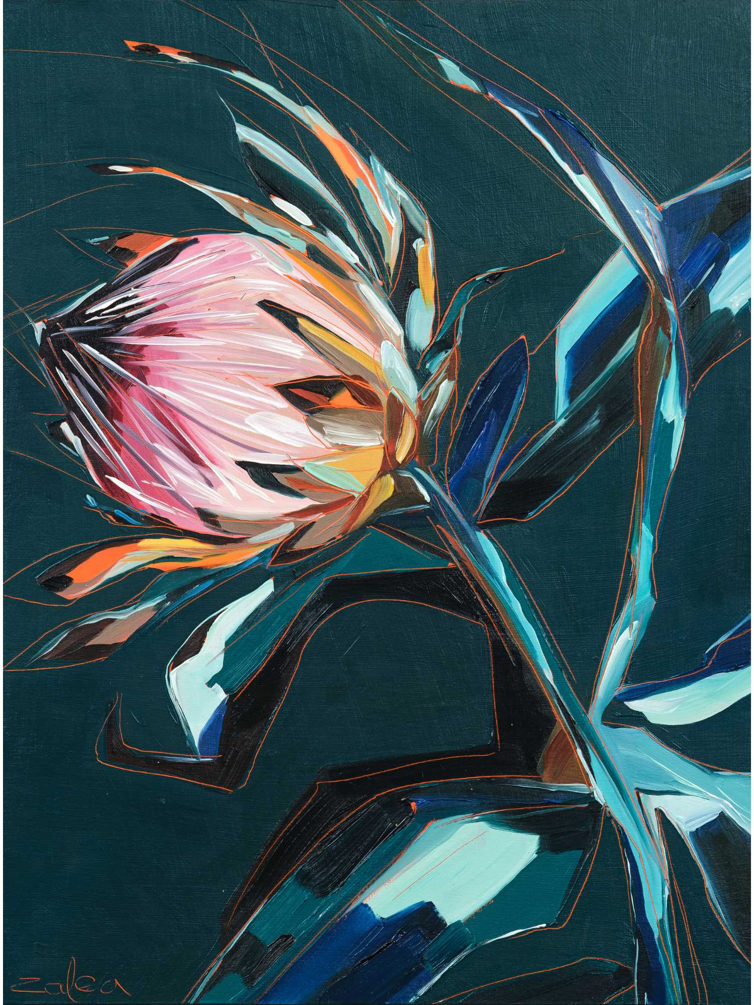 Discover the mesmerising allure of "Moody Moments", set against a captivating dark teal backdrop. The harmonious dance of bright oranges, pinks, whites, and blues brings life and energy to your space, while the subtle scratched details add a touch of depth and uniqueness. With its powerful symbolism of strength and resilience, this artwork serves as an inspiring reminder to embrace life's colorful moments. Own this masterpiece today and infuse your surroundings with a captivating burst of vitality and positivity.