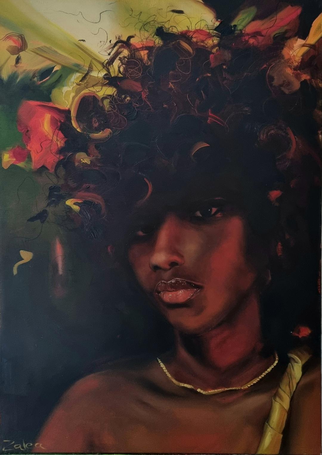 This painting is part of a series of woman from South Africa. This African beauty is called THANDI, which in Zulu means One Who Loves Deeply. She was inspired by my homeland, a reminder of a beautiful South Africa with a sad apartheid past.