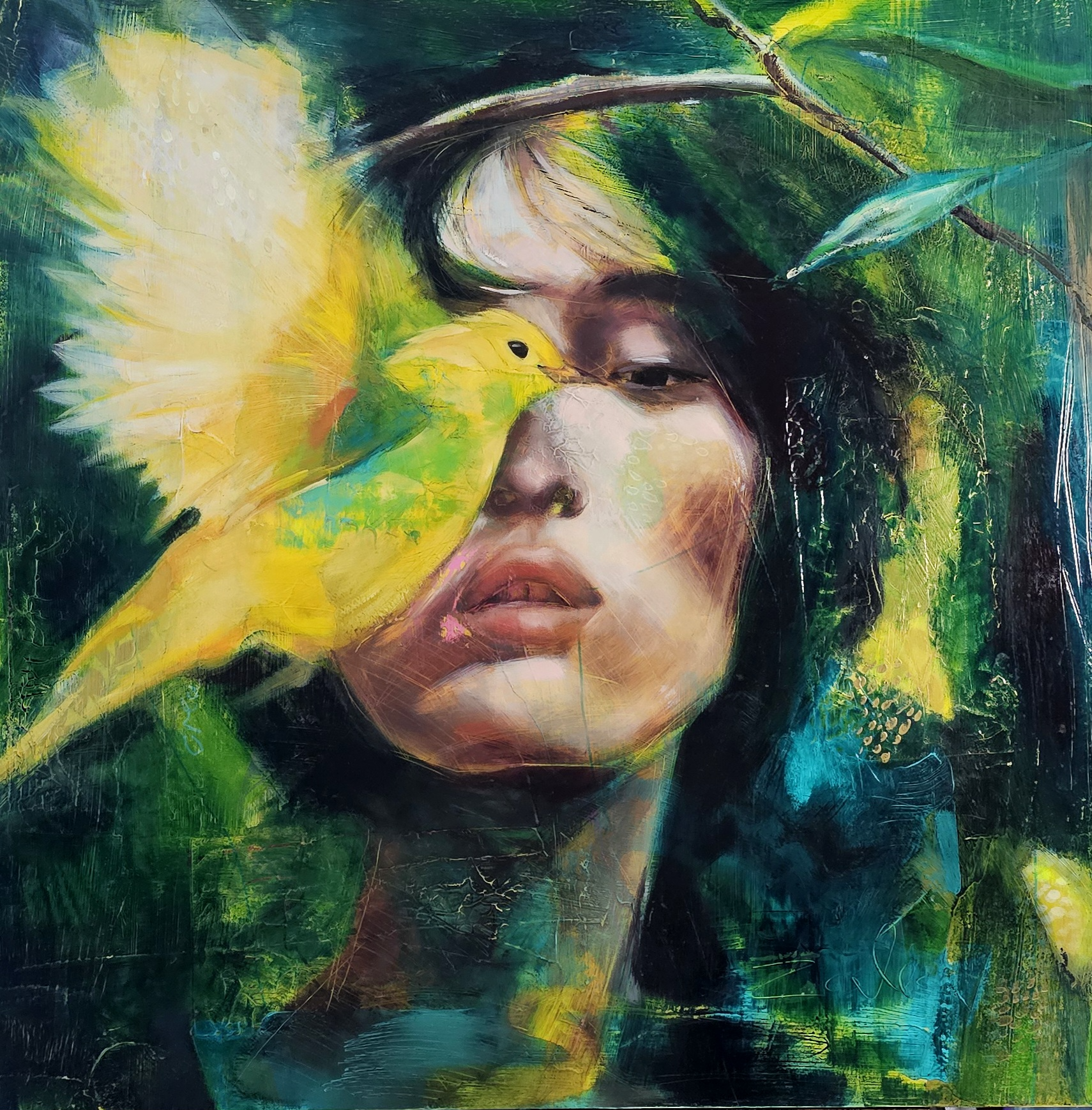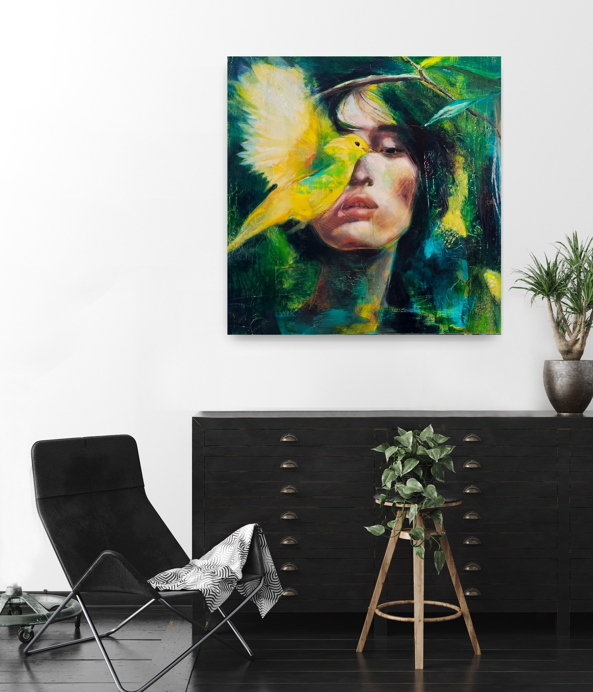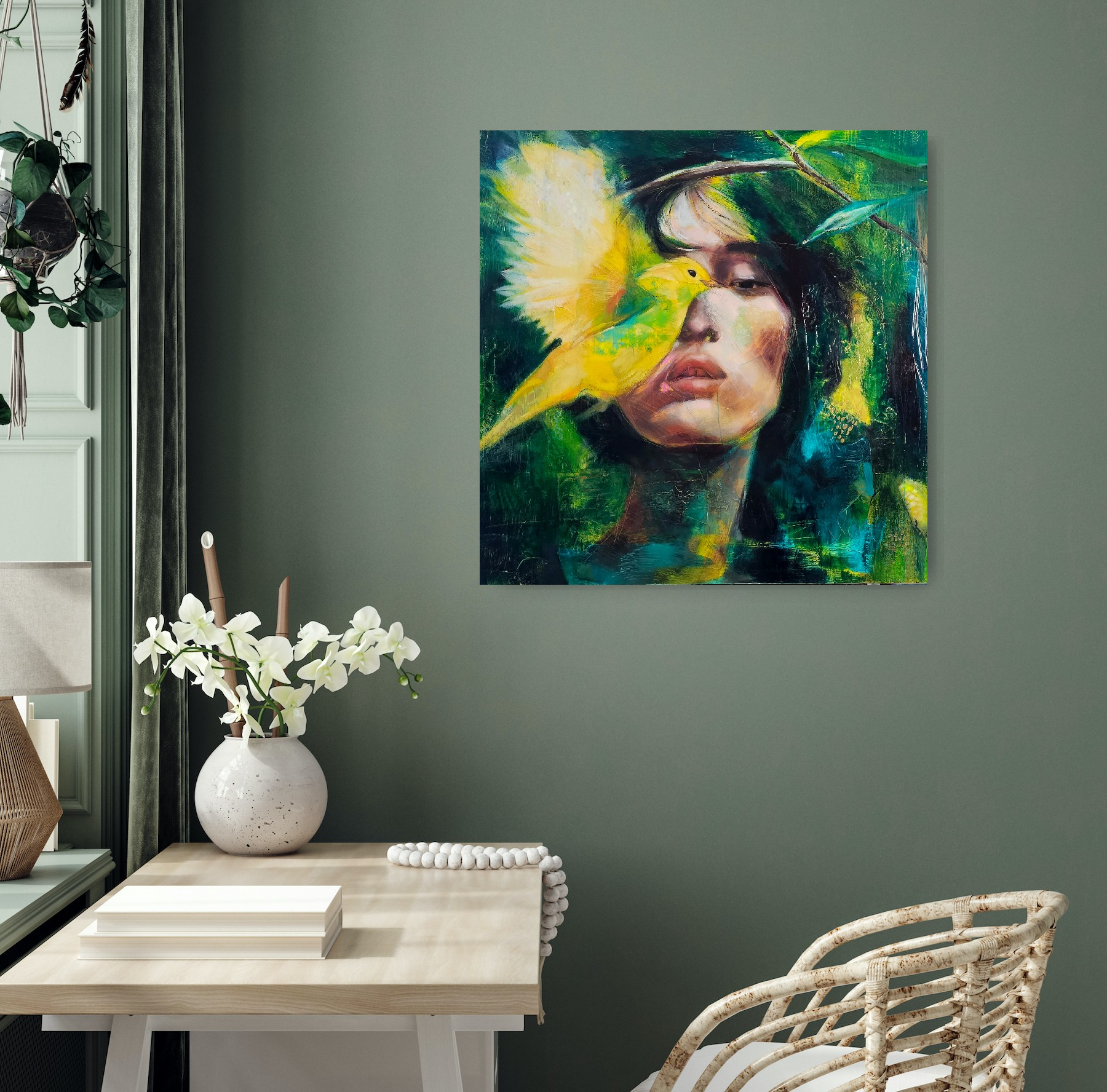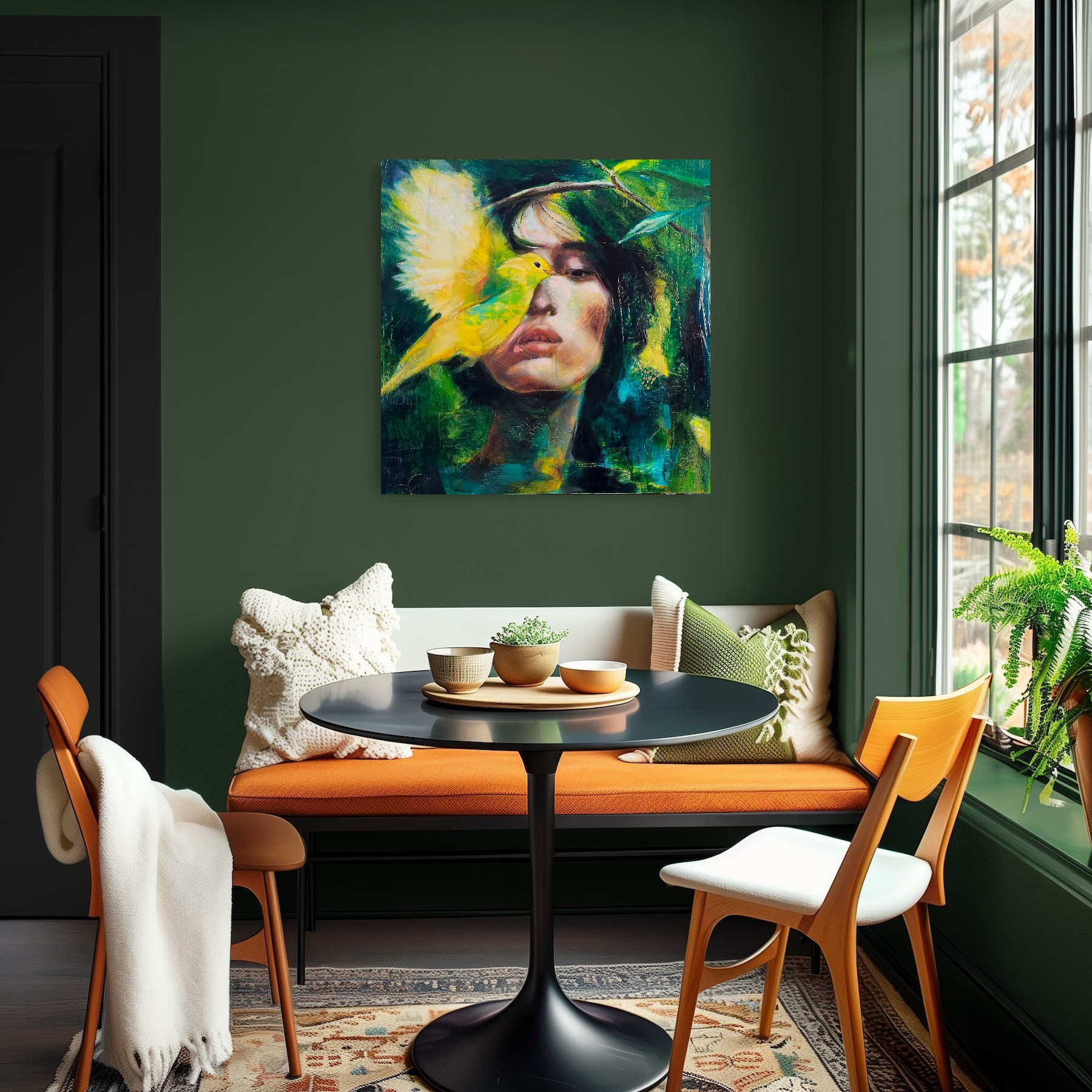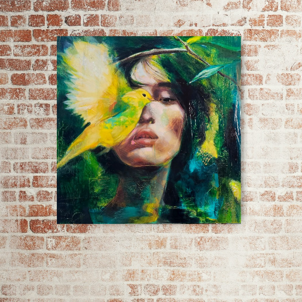 Sometimes the loudest voices demand our attention, but it is the quietest voice that truly saves. In this painting, the bird is a symbol of God’s still, soft voice — tender, subtle, yet profoundly powerful. Surrounded by layers of greens and yellows, the colors echo growth, hope, and renewal, mirroring the life-changing impact of listening to His gentle guidance. Every brushstroke celebrates the quiet ways God moves in hearts, transforming lives without fanfare, yet leaving an indelible mark.
